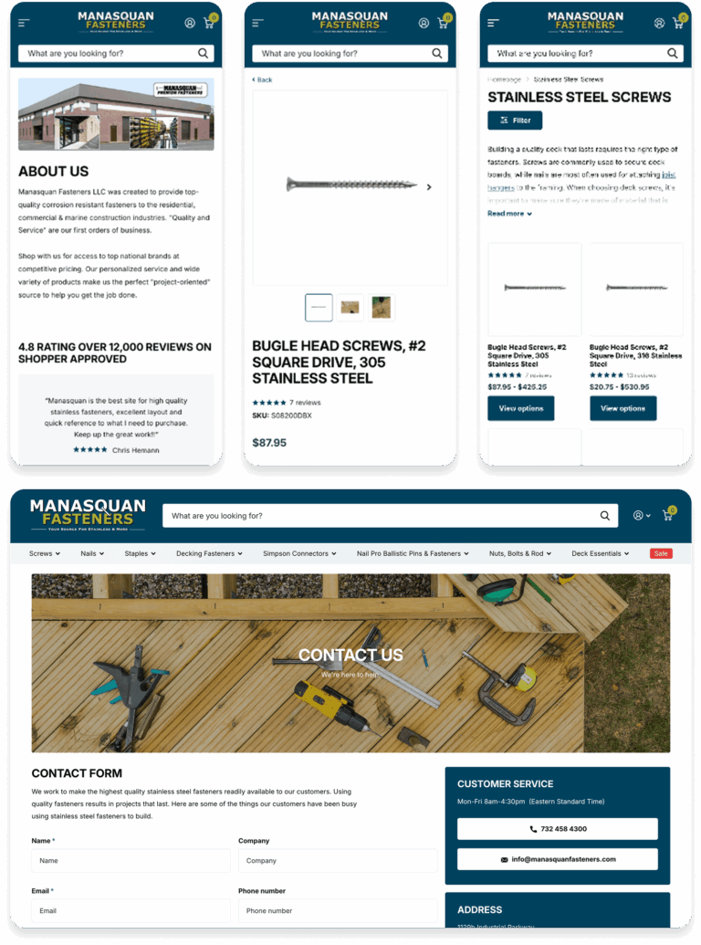 Manasquan Fasteners was running on CommerceV3, a legacy platform that was slowing growth. Managing their 2,000+ SKUs required too much manual work—dropship fulfillment, inventory tracking, and shipping processes were cumbersome. The existing system made it difficult to provide an optimized experience for both retail and B2B customers, and the team lacked intuitive admin controls to easily manage products, orders, and pricing. They needed a platform that could streamline operations, improve the customer journey, and support a blended B2B/B2C strategy.